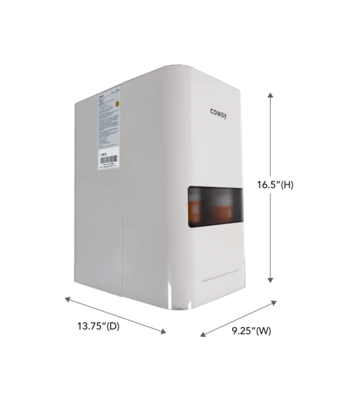 A: 가로 9.25인치, 세로 16.5인치, 깊이 13.75인치의 슬림한 일체형 디자인으로, 복잡한 싱크대 하부 공간에도 넉넉하게 설치가 가능합니다. 전용 파우셋이 포함되어 주방 공간을 더욱 넓게 활용할 수 있습니다.